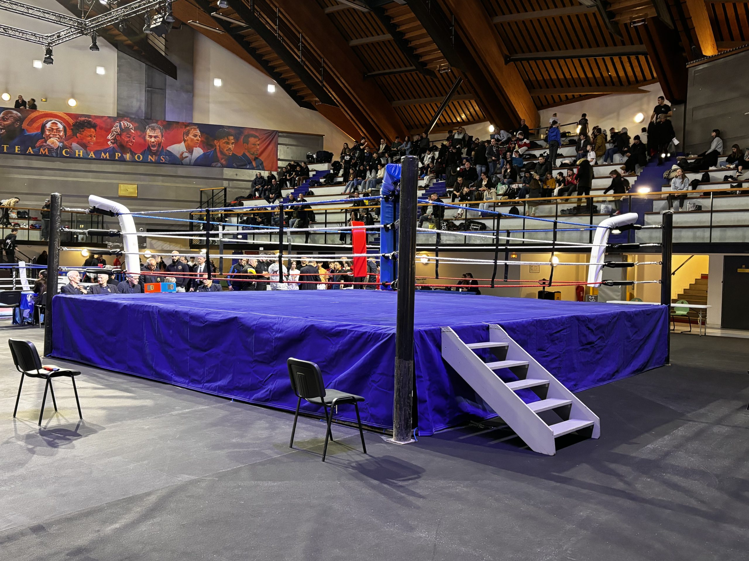 Avec des dimensions de 6x6m et une hauteur surélevée de 1m, ce ring garantit une visibilité optimale et une expérience immersive pour les spectateurs.